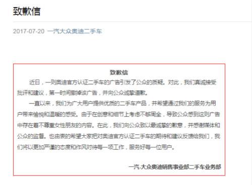 7月20日,一汽-大众奥迪销售事业部二手车业务部发布致歉信,就之前发布让公众感到广告存在着不尊重女性朋友的内容向公众致歉。