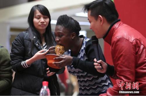 资料图:2016年12月3日,武汉首届“趣味吉尼斯 挑战大胃王”国际邀请赛,以吃热干面为主题,在武汉市汉举行,吸引了50位在武汉外国人参赛。 图片来源:CNSPHOTO