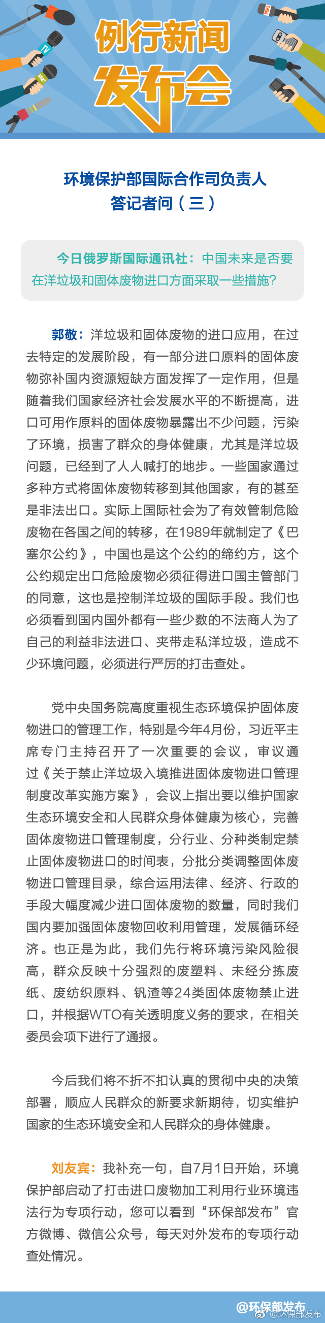 中新网7月20日电 今天上午,环境保护部举行7月份例行新闻发布会。会上,针对“中国未来是否要在洋垃圾和固体废物进口方面采取措施”的问题,环保部国际合作司司长郭敬表示,必须看到国内国外都有一些少数的不法商人为了自己的利益非法进口、夹带走私洋垃圾,造成不少环境问题,必须进行严厉打击查处。
