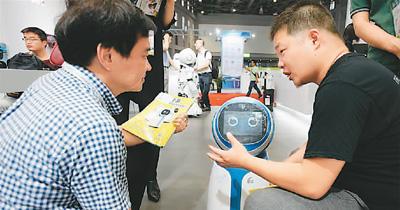 第6届中国国际机器人展览会上,工作人员(右)在向参观者介绍一款陪护智能机器人。