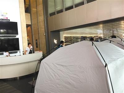 7月21日,乐视大厦前台,有自称讨债者搭起帐篷。新京报记者 金彧 摄