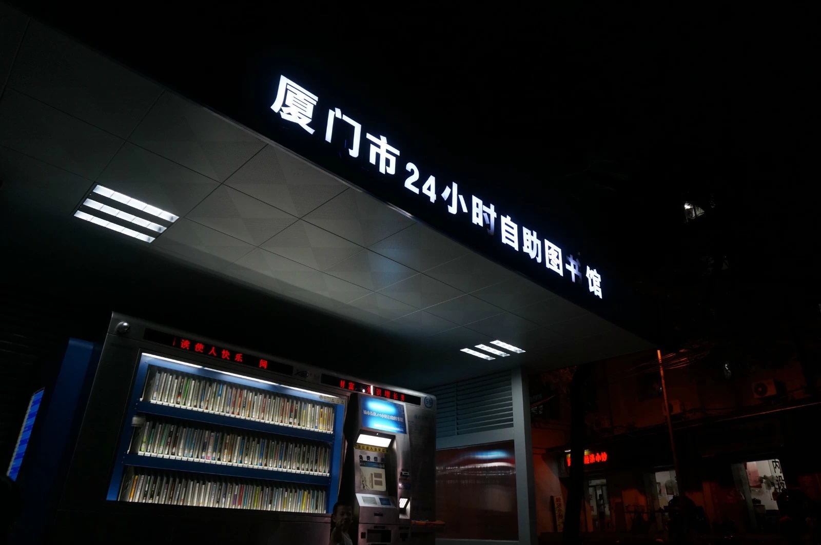 一座由钢材和玻璃构建的框架建筑,矗立在厦门市思明区一个普通的公交站台旁边。这是厦门市刚刚时兴的24小时街区便民自助图书馆。