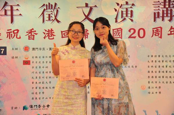 我省获奖选手:张万蓉苗(左)、吴林颖(右)海峡两岸“民族心中华情”青少年征文演讲比赛已举办十一届,在海内外华人华侨中具有较大影响力。比赛获得澳门电视台、澳门日报、澳门大众报、华侨报等当地主流媒体的全程关注与报道。我省选手在大赛期间不仅展现了突出的演讲专业水平、饱满的精神风貌和全面的综合素质,并通过比赛增进了彼此交流,搭建了友谊桥梁,增强了海峡两岸暨香港、澳门地区当代青少年对祖国的认同。