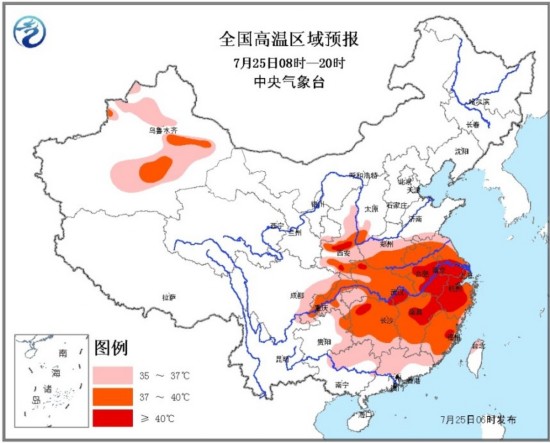 人民网北京7月25日电 据中央气象台网消息,中央气象台7月25日06时继续发布高温橙色预警:预计,7月25日白天,西北地区东南部、黄淮南部、四川盆地中东部、江汉、江淮、江南、华南北部等地有35℃以上的高温天气,其中,陕西关中地区、河南南部、安徽、江苏、上海、浙江、福建、江西、湖北、湖南、四川东部、重庆等地的部分地区最高气温可达37~39℃,局地可超过40℃。