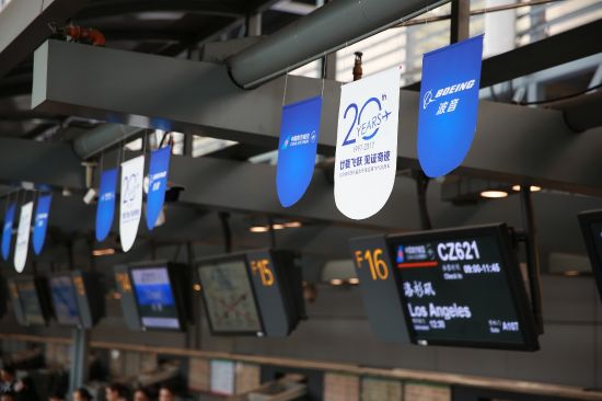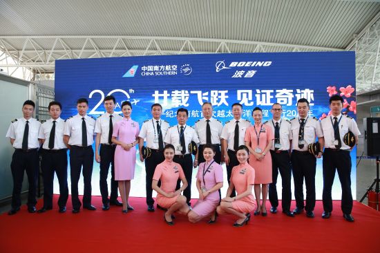 7月21日,中国南方航空集团公司在广州举行“廿载飞跃 见证奇?!敝魈饣疃?纪念南航首次不经停跨太平洋飞行、开通广州-洛杉矶航线20周年。当天,南航将新型波音777-300ER客机执飞的广州-洛杉矶CZ621航班命名为“越洋新征程”主题航班,并安排当年执飞首航航班的乘务员再次执飞“越洋新征程”主题航班。