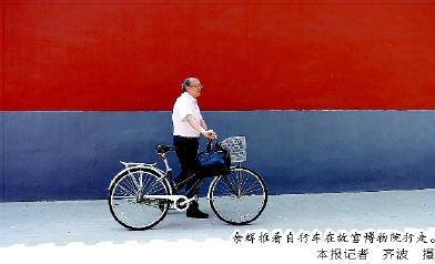 余辉推着自行车在故宫博物院行走。 本报记者 齐波 摄