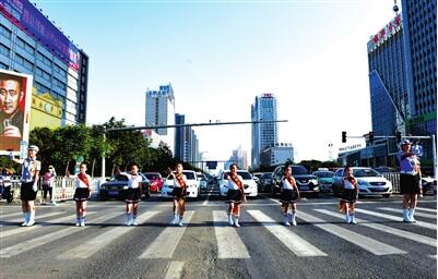 7月11日,河北邯郸市滏东大街与联纺路交叉口南北方向红灯亮起时,一阵“斑马线上亮红灯,请您等一等,红灯一会儿变绿灯……”音乐响起,小学生在女交警的带领下在斑马线前跳起了“等灯舞”。(07-20北京青年报)