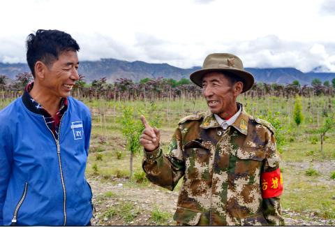 西藏南木林县艾玛乡德庆村63岁的赤列与村主任潘多在交流护林经验。(鞠传江 摄)