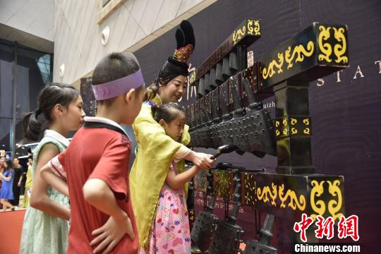 随州博物馆工作人员教小朋友演奏编钟复制件。 王文彬 摄