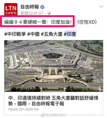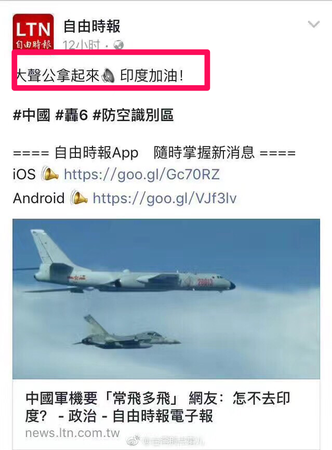 台湾《自由时报》27日深夜在网站上发布一篇题为<中国军机“长飞多飞” 网友:怎不去印度>的文章,随后将其转帖至脸书(Facebook)上,并公然配上“大声公(大喇叭)拿起来,印度加油”的文字,下边还有其支持者随之附和,“欢迎啊!来帮空军跟‘国会’要预算买新战机”、“非常欢迎,这样能训练台湾官兵应变能力”。