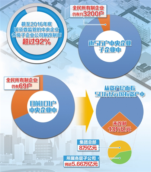 近年来,国资委积极推进国有企业公司制改革。截至2016年底,国资委监管的中央企业各级子企业公司制改制面超过92%。但由于改制成本高、耗时长等原因,一定程度上影响了改制工作进度。目前101户中央企业中,仍有69户集团公司为全民所有制企业;近5万户中央企业各级子企业中,仍有约3200户为全民所有制企业。