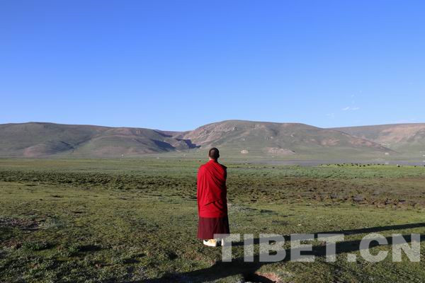 7月19日清晨,从玉树市往西北约80公里的隆宝滩边停下一个车队,一位身着绛红色僧服的年轻僧人走下车来,兴致勃勃地步向隆宝滩绿油油的草甸,身后还跟着几位着僧服的僧人。这一带属于玉树州著名的隆宝滩自然?;で?,此时正处在一年中最好的季节?;饭怂闹?,一望无际的高寒草甸和湿地绿油油的,像地毯一样铺在这片海拔4200多米的高原谷地上,远处起伏的山脉像凝固的绿色波浪。