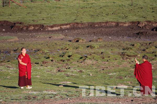 这时正是早晨7点多钟,各种野生动物:高原鼠兔、鹰、黑颈鹤、斑头雁、棕头鸥等也刚刚醒来,四处活动,享受清晨高原太阳的温暖。那位年轻僧人对这片美景显得非常留恋动情,他站在草原上请随行人员为他照相留念。其实,这位年轻僧人就是出生于西藏那曲地区嘉黎县的班禅额尔德尼?确吉杰布。因为生长在草原,所以十一世班禅大师每次见到草原美景,总是充满了感情和发自内心的热爱,所以此次停在这片隆宝滩草原上赏景留影。