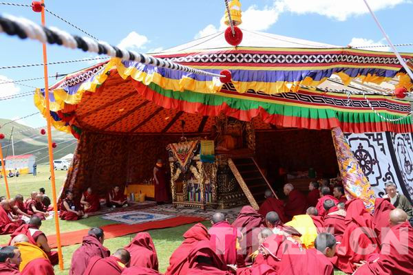 夏日草原的阳光下,班禅大师在贡萨寺准备的华帐宝座上进行讲经和灌顶,同时大师还从佛法的角度对僧人和群众进行了遵纪守法、团结互助、积极改善生活、改正恶习、维护民族团结和社会和谐等方面的教诲。