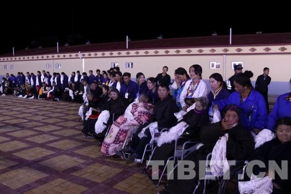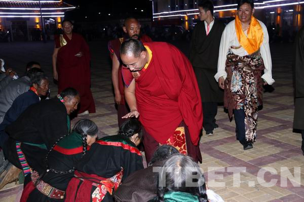 夜已深了,班禅大师还前往治多县幸福敬老院为一直等候在那里的老人们一一摸顶赐福,并讲经祈颂。有些重病和瘫痪在床的老人得到班禅大师的摸顶赐福,幸福地闭上眼睛泪流满面,嘴里不停地称颂“谢谢班禅仁波切!”