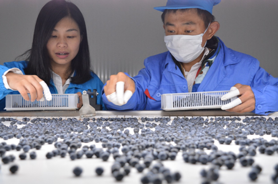 沈修羽正与工人一起挑拣蓝莓(左一为沈修羽)