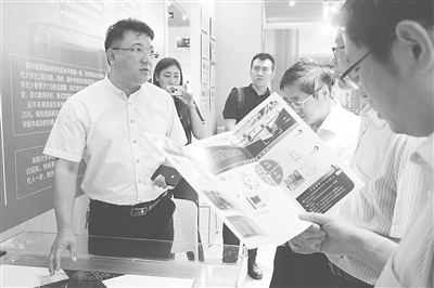 盛业军(左一)向调研齐盛新材料公司产品的来宾介绍情况。