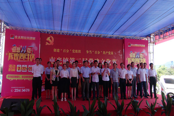 7月25日,屯溪区工商联副会长企业单位金太阳集团在14周年店日迎来了屯光镇第二届党建文化节?;粕绞形枪煤蜕缁嶙橹のㄖ案笔榧侵煊澜?,黄山市工商联副会长、秘书长柯伯发,及区、企业有关领导、党员代表共200余人参加此次活动。