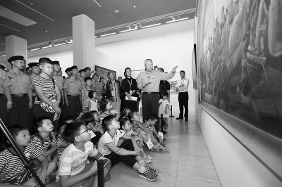 艺术专家李翔在展厅为武警官兵和孩子们作导览。