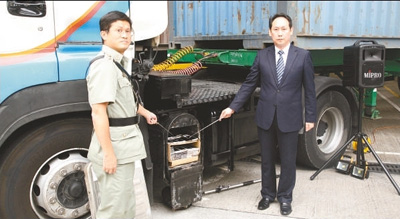 温庆全(右)与海关军装同事捣破跨境走私手提电话的犯罪集团,检获的9300部手提电话分别藏于4辆集装箱车废气排放管暗格内。香港海关供图