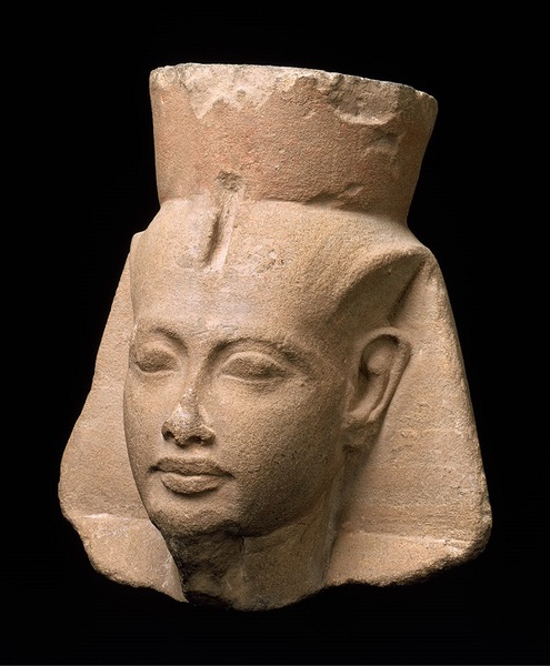1922年在国王山谷发现的图坦卡蒙黄金面具广为人知,而展览展出的这件图坦卡蒙法老头部像与那件面具非常相像,都有着一双杏仁眼和清晰的面部特征。 他所配带的红白双重皇冠仍然保留着红色一半的痕迹,双重冠象征着上下埃及统一。 额头上的凹槽处可能嵌有象征着法老神权的眼镜蛇形象。