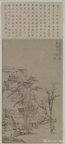 弘仁还是新安画派的开创者,他的绘画风格中能体现出来对倪瓒的喜爱,这幅画是以笔沾焦墨绘的竹石流泉,构图简洁,笔墨冷峻,画面干净清爽,特点还是冷逸。创作这幅作品是他50岁,创作的盛年。