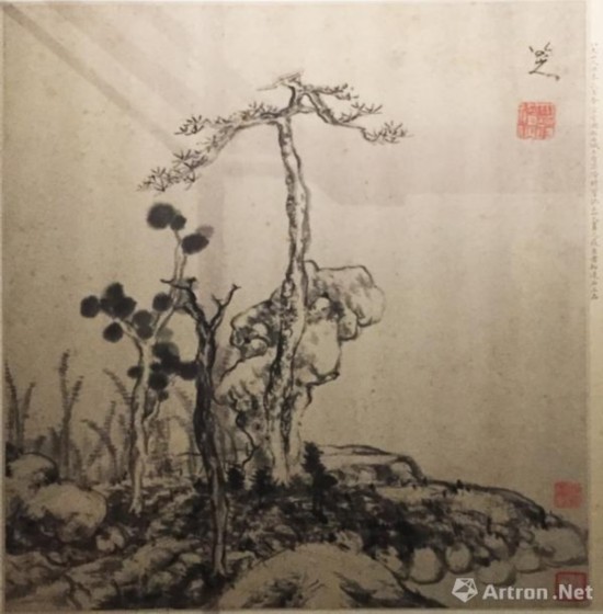 这件八大山人的图页截取了山水的一个局部,聚焦于一块石头旁边傲然挺立的孤松,略辅以坡石、杂树,更凸显出松树的孤高和不凡?;嬉愿杀实迦疚鳎誓渴炖侠?,天然去饰??钍稹鞍舜笊饺恕?,是他晚年的作品。