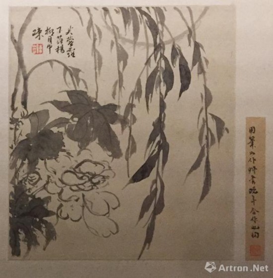 这册是傅山、傅眉父子的传世绘画名迹,去年北京画院的傅山大展中就借了这套册页展出。共计十六开,其中傅山所作山水四开,花卉一开,傅眉作山水十一开。傅山的好友戴廷栻题引首“愚公轮蜕”。