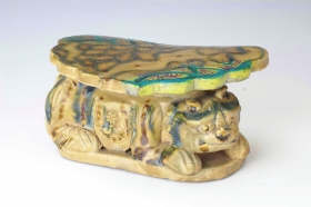 唐长沙窑青釉褐绿彩兽座瓷枕。