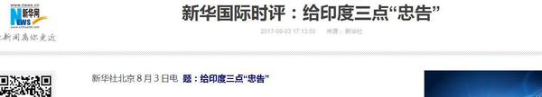 新华社8月3日下午发表题为“给印度三点‘忠告’”的时评文章,“一是希望印度不要强词夺理,不要胡搅蛮缠;二是希望印度尽快老老实实退回去;三是希望印度不要执意挑衅中国,与中国为敌没有好下场。”