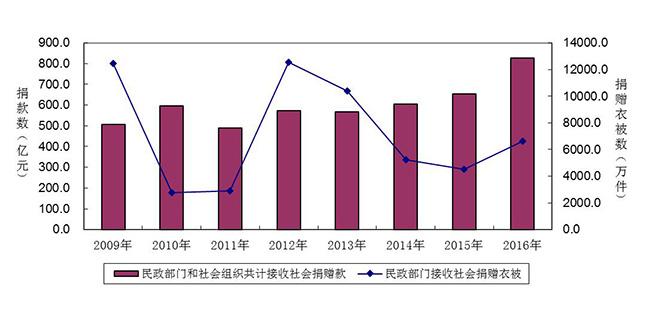 慈善事业方面:1、慈善捐赠。截至2016年底,全国共建立经常性社会捐助工作站、点和慈善超市2.9万个(其中:慈善超市8966个)。全年共接收社会捐赠款827.0亿元,比上年增长26.4%,其中:民政部门直接接收社会各界捐款40.3亿元,各类社会组织接收捐款786.7亿元。全年各地民政部门直接接收捐赠物资价值折合人民币7.4亿元,捐赠衣被6638.3万件。间接接收其他部门转入的捐赠物资折款1.4亿元,社会捐款5.9亿元,衣被488.0万件。全年有1165.8万人次困难群众受益。全年有931.0万人次在社会服务领域提供了2522.6万小时的志愿服务。