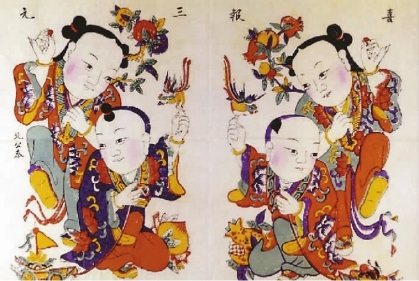 “三阳开泰” :图画一般是母子三头羊,在山上吃草?!把颉庇搿把簟蓖簦叭艨庇直怀莆叭艚惶?,古人将每个月都和卦联系起来,如正月就是泰卦,卦象由三个阳爻和三个阴爻组成,古人以为这时候冬去春来,阴消阳长,有吉亨之象,寓意祛尽邪佞,吉祥好运接踵而来。所以往往用“三阳开泰”作为新年时的称颂之语,祈求新年平安如意。在《周易》中,“泰”卦代表着吉祥好运, 《易·泰》曰:“泰,小往大来,吉亨。 ”还有个成语叫否极泰来,就是说逆境达到极点,就会向顺境转化。
