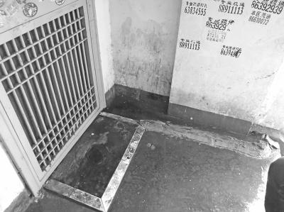 昨天上午,武汉晚报记者来到现场,一到14栋楼下,一股臭气就扑鼻而来,楼梯上满是水渍。记者在四楼看到,漏水业主家的防盗门底部满是污物,不时有污水从门缝渗出。