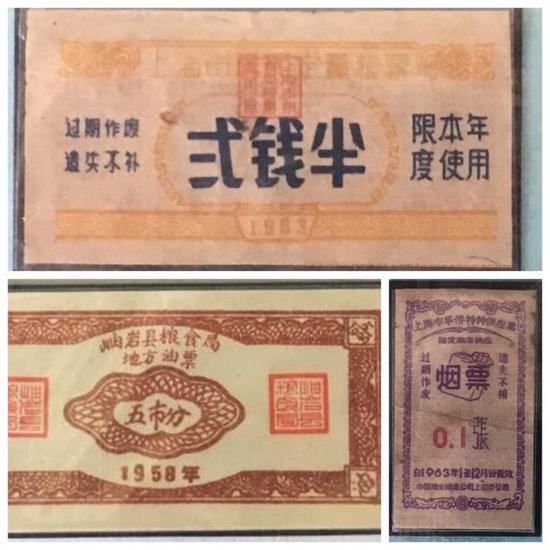 这三张票证也是创下基尼斯纪录的。最上方是1963年上海市专为食品商店找零使用发行的粮票。在那个“锱铢必较”的时代,一小把粮也是粮,于是就有了这样的“找零券”。左下角的油票是1958年辽宁省一处粮食局发行的油票,油票的正面右上角印了5/1000,是千分之5斤的意思。右下角的烟票为0.1一张,换算下来相当于两根烟。