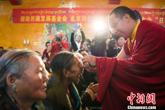 图为援助西藏发展基金会理事长、中国佛教协会副会长班禅额尔德尼·确吉杰布为术后的白内障患者揭纱布 何蓬磊 摄