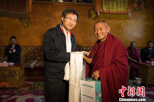 图为北京同仁张晓楼眼科公益基金会秘书长、北京同仁医院眼科主任魏文斌教授(左)向扎什伦布寺代表加孜·念扎赠送护眼灯 何蓬磊 摄