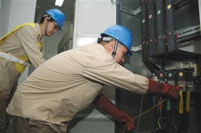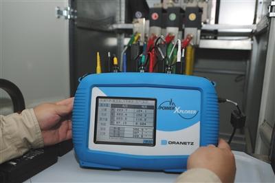 北京电科院实验室,实验人员把电能质量测试仪接入配电室控制中央空调电力输送的电箱。