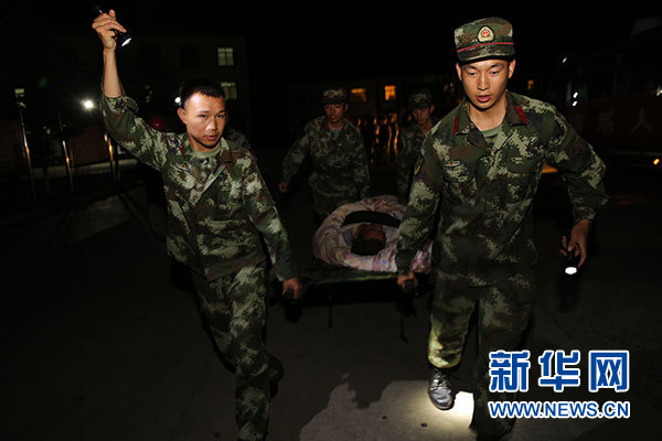 8月8日,四川阿坝州九寨沟县发生7.0级地震后,当地武警官兵疏散游客,救助群众。 新华社发