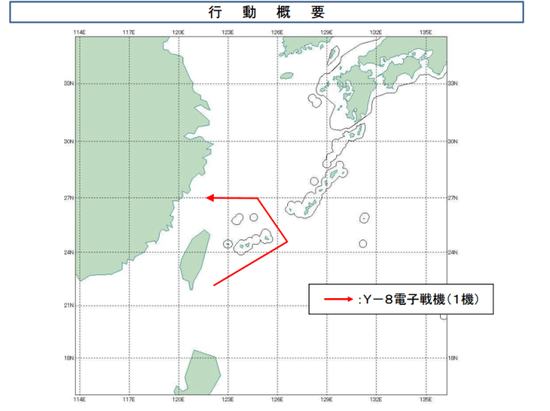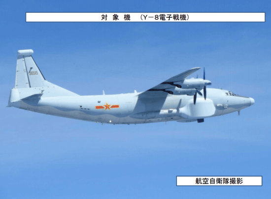 根据日本防卫省提供的消息,这架中国战机型号为“运八”电子战机,飞行路线从南向北,然后经过宫古海峡向西飞往中国大陆,飞行路线环绕中国台湾岛。