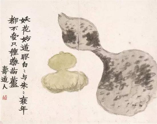 晚清民国以降,以吴昌硕、齐白石为代表的画家将葫芦题材的绘画发挥到极致。他们不仅将葫芦作为绘画本体来描绘,更赋予葫芦多重文化内涵,这就使得一个极为小众的绘画科目升堂入室,引起美术史学者的垂注。