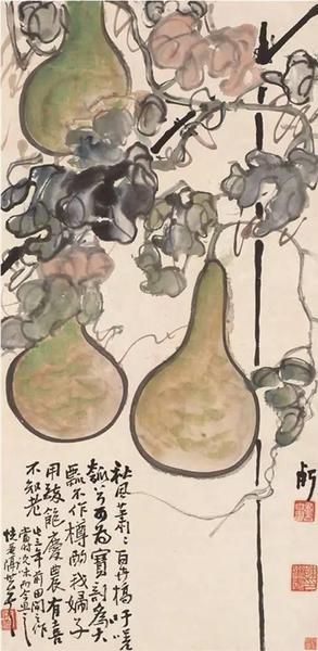 葫芦画虽然只是齐白石花卉蔬果中的一个小小分支,但小中见大,从其不同题材、不同时期、不同技法的葫芦画中,可以窥测其花卉画演变的痕迹,以及其一贯坚持的艺术理念和创作态度。正如有学者指出的,齐白石这种“带有泥土味的形象不是简单的写生和记录,只是一种文化的记忆,是传达文化的一个媒介”9。这对于我们从不同侧面了解齐白石艺术全貌,无疑是具有裨益的。这或许便是探讨齐白石葫芦绘画的意义所在。
