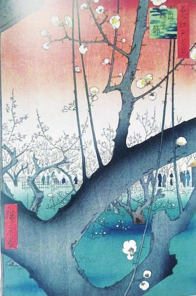 安藤广重(Ando Hiroshige),后又名歌川广重( Utagawa Hiroshige),1797—1858,江户人。江户(Edo),今东京都千代田区,日本首都旧称。广重是日本浮世绘大画家,其画典雅,充满诗意,与葛饰北斋开创了“名所絵”的风景画,对后世影响极大。广重一生创作了五千多幅画,梅花是他画得较多的题材之一。幽郁与秀丽的笔致,描绘拥有闲情逸致的人们置身于梅花之中,表达了画家面对人与自然美景的美好心情与祝福。