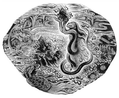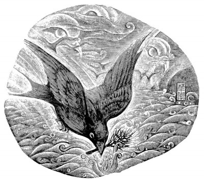 受众对视觉图像往往有先入为主的定势心理,明清《山海经》部分图像的因袭性正是这种心理的反映。作画者如此,读者也如此。所以“像不像”是绘画者平衡读者欣赏与创新之间的难点。徐龙宝的《山海经》木刻插图在平衡中取得了突破。虽取形于古,但造型出新,以立体的形象充实了平面的线条。徐龙宝在创作中继承了中国传统美术的云水构图法,使主体画像之外的空间充满了流动感,同时在其中隐藏了诡秘的眼睛和虚幻的造型,精心营造了神话迷幻的场景与远古缥缈的氛围。他还善于从西方的虚构造型中借鉴,他读过我在《文汇读书周报》上连载了三期的《美人鱼藏书票的文化意蕴》后,以《山海经·海内南经》中的氐人国为据,创作了一张美人鱼藏书票。这张藏书票就是本书第62幅插图。此图中的“人鱼”造型不同于明代《山海经》的蒋应镐绘本,清代胡文焕《山海经图》和汪绂《山海经存》中的“人面而鱼身”,而是以接近人们熟悉的“美人鱼”形象进行构图,将这一中西文化中共有的传说作了融合再现。女娲是中国神话中的始祖母神,汉代王逸在注《楚辞·天问》中曾发出“传言女娲人头蛇身,一日七十化,其体如此,谁所制匠而图之乎”的感叹。徐龙宝为多变的女娲设计了宏大的场面表现这位“化万物者”,以补天为主景,辽阔的背景细部刻画了隐现的抟土造人,肠化十神,具有更丰富的创世神话内涵。