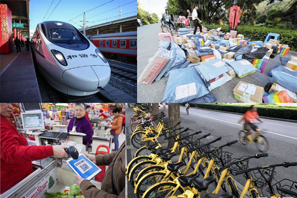 如果说高铁是中国人织就的联通中国各地、联通中国与世界的一张有形的网,那网购则是中国人缔造的联通中国各地、联通世界每个角落的一张无形的网。支付宝则是全球生产者、经营者和消费者,超越地缘限制在这张无形的网上轻松交易的金融血脉。共享单车就是解决“最后一公里”难题的健身“小伙伴”。
