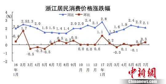 中新网杭州8月10日电(见习记者 胡哲斐 实习生 傅凌波)10日,记者从国家统计局浙江调查总队获悉,2017年7月,浙江居民消费价格总水平(以下简称“CPI”)同比上涨2.1%,环比上涨0.3%,其中鲜菜价格涨幅最大,同比上涨7.9%,环比上涨9.0%。
