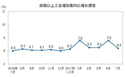 中新网8月14日电 据国家统计局网站消息,2017年7月份,规模以上工业增加值同比实际增长6.4%(以下增加值增速均为扣除价格因素的实际增长率),比6月份回落1.2个百分点,比上年同月加快0.4个百分点。从环比看,7月份,规模以上工业增加值比上月增长0.41%。1-7月份,规模以上工业增加值同比增长6.8%。