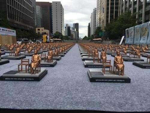 韩国慰安妇问题对策协议会与正义?记忆财团当天上午8时起,在首尔市钟路区清溪广场举办纪念日军“慰安妇”受害者雕塑展,展出500座小型“少女像”。