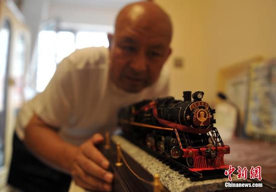 8月14日,铁路工作者赵联忠在家里整理擦拭烧煤油的信号灯、各式火车模型,站台票、铁路时刻表、铁路广告等。自上世纪80年代,赵联忠开始收集与铁路有关的各类物品,30多年来,他的铁路藏品达到数万件,就如同一个小型的铁路文化收藏馆,真实地见证了中国铁路的发展史。图为赵联忠整理自己的藏品。