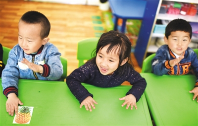 青海免费教育惠及各族学生。图为青海省黄南藏族自治州幼儿园小班教室内,藏族女孩夏央娜姆(中)和伙伴在课堂上。 新华社记者 张宏祥摄 |