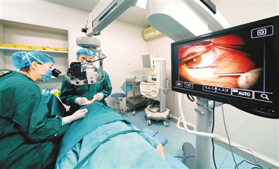 “行知中国”助力关爱西部青少年眼健康。图为兰州普瑞眼科医院医生在手术室为高三学生罗进荣实施眼科手术。 新华社记者 陈建力摄 |